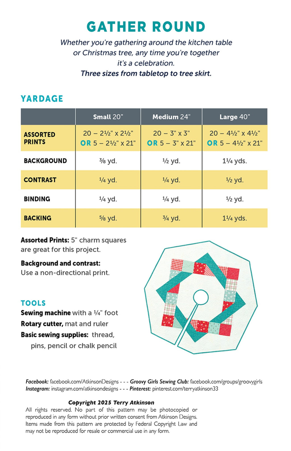 Whether you're gathering around the kitchen table, patio table, or Christmas tree, any time you're together it's a celebration. Three sizes included from tabletop to tree skirt.