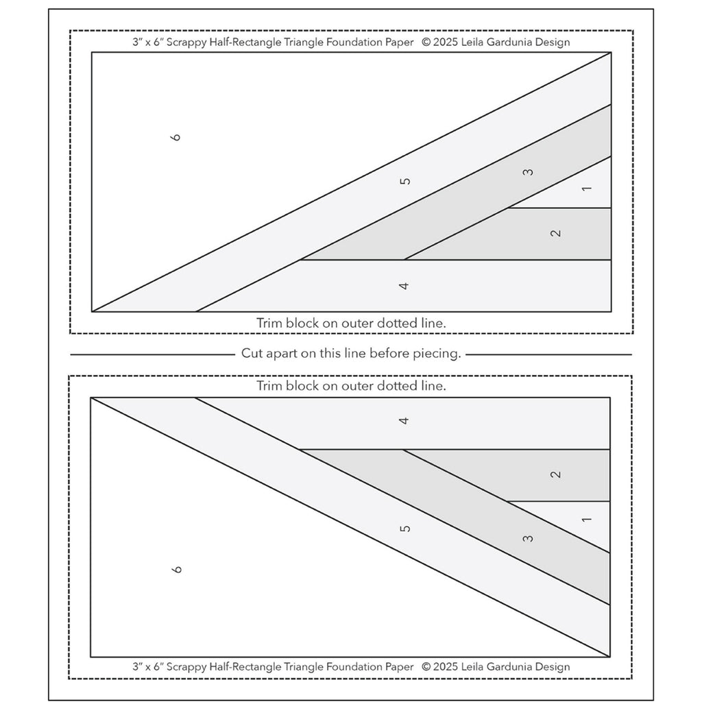 Bust through your scraps with foundation paper-pieced 3” x 6” Scrappy Half-Rectangle Triangles (HRT). This foundation pad makes it easy to choose a foundation and start sewing. No fussing with printers! The foundations are pre-printed on lightweight paper making them easy to see through and remove. When you start playing with the Scrappy Half-Rectangle Triangles, you'll discover that there are endless designs you can make. You can use the blocks in a quilt, wall hanging, bag, or more! The 7” x 8” Scrappy Half-Rectangle Triangle pad contains: - 25 different Scrappy HRT designs, 2 left- and 2 right-facing of each design for a total of 100 foundations - Basic cutting and construction instructions - Block requirements for different quilt sizes - A link to written and video instructions on how to foundation paper piece the Scrappy Half-Rectangle Triangles